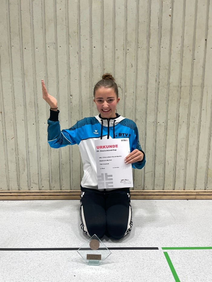 Am Samstag ging Magdalena für Team Bayern an den Start. Sie startete in Gerade und Spirale. Als erste Disziplin stand Spirale auf dem Plan. Magdalena turnte eine saubere Kür ohne Großabzüge und bekam von den KampfrichterInnen 6,05 Punkte. Ihre zweite Disziplin war Gerade. Auch hier zeigte sie sehr gute Leistungen und wurde mit 7,7 Punkten belohnt. In ihrer Wettkampfklasse Gerade + Spirale bei den 15- und 16-jährigen war dies die jeweils drittbeste Punktzahl. Nach der Endabrechnung belegte sie somit den dritten Platz und erhielt Bronze. Herzlichen Glückwunsch!