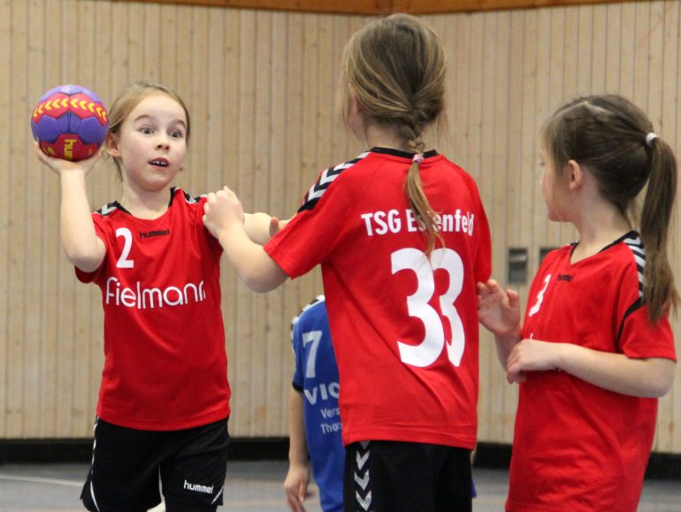 Die Handballabteilung der TSG Estenfeld hatte gerufen – und viele kamen zum Spielfest bzw. Mini-Turnier am dritten Adventssonntag in der Mehrzweckhalle Weiße Mühle. 130 aktive Kinder in 19 Mannschaften aus acht Vereinen: Es war einen Nachmittag lang mächtig was los auf den Spielfeldern und drum herum. Fleißige Eltern hatten die Felder nebeneinander in der Halle aufgebaut, so dass immer zwei Spiele parallel laufen konnten. In der Hallenmitte konnten die Kinder an Kästen und auf Matten toben und turnen.