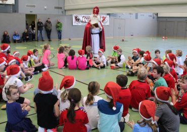 Und am Ende richteten sich alle Augen auf die Hallentür: Angekündigt durch sein Glockengeläut schritt ein bepackter Nikolaus, „standesgemäß“ mit Mitra, Umhang und goldenem Buch, auf die fast 60 Kinder…